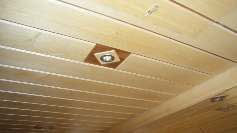 | individuell gefertigte Nut-und Federdecke | Deckendetail Ahorn+Kirschbaumholz | Deckenrondell für Leuchtenset | abgehängte Erkerdecke Kirschbaum |