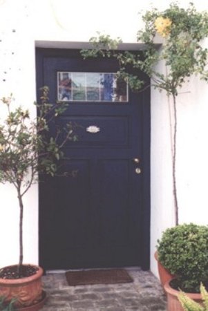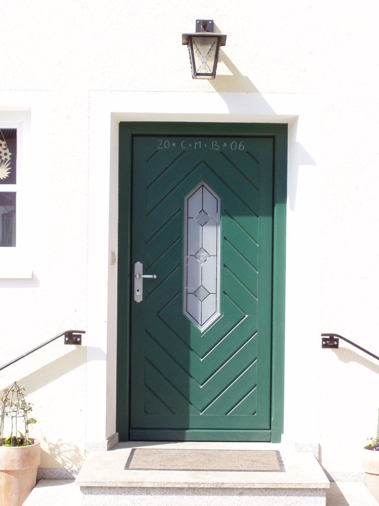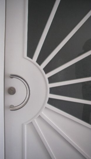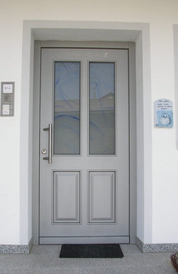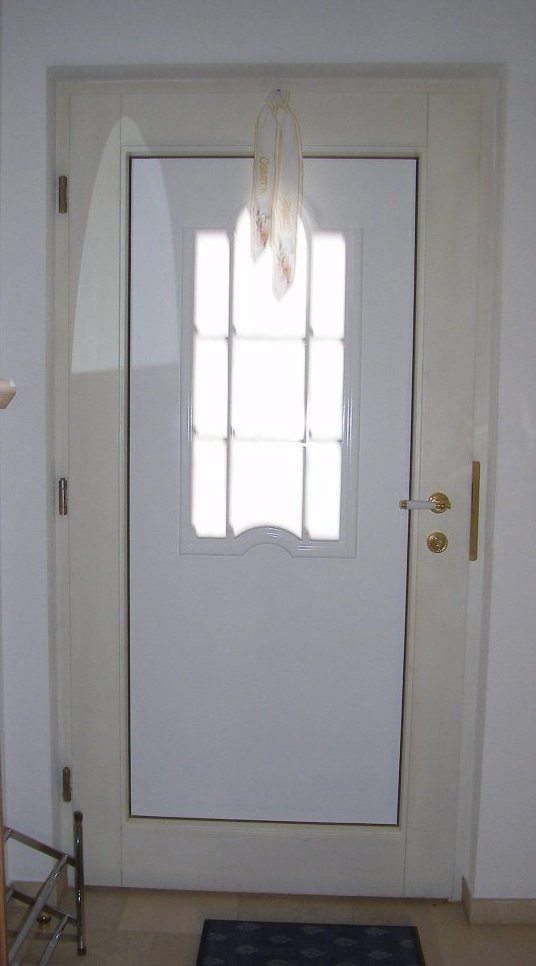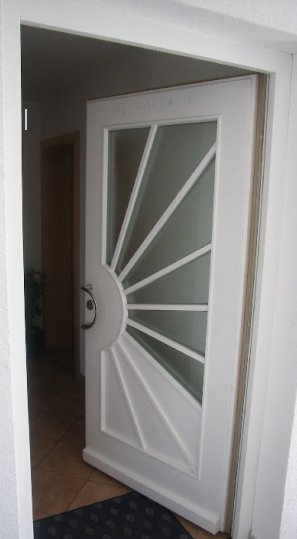 | Haustüre weiß lackiert mit Verglasung - rechts ein Griffdetail | |||